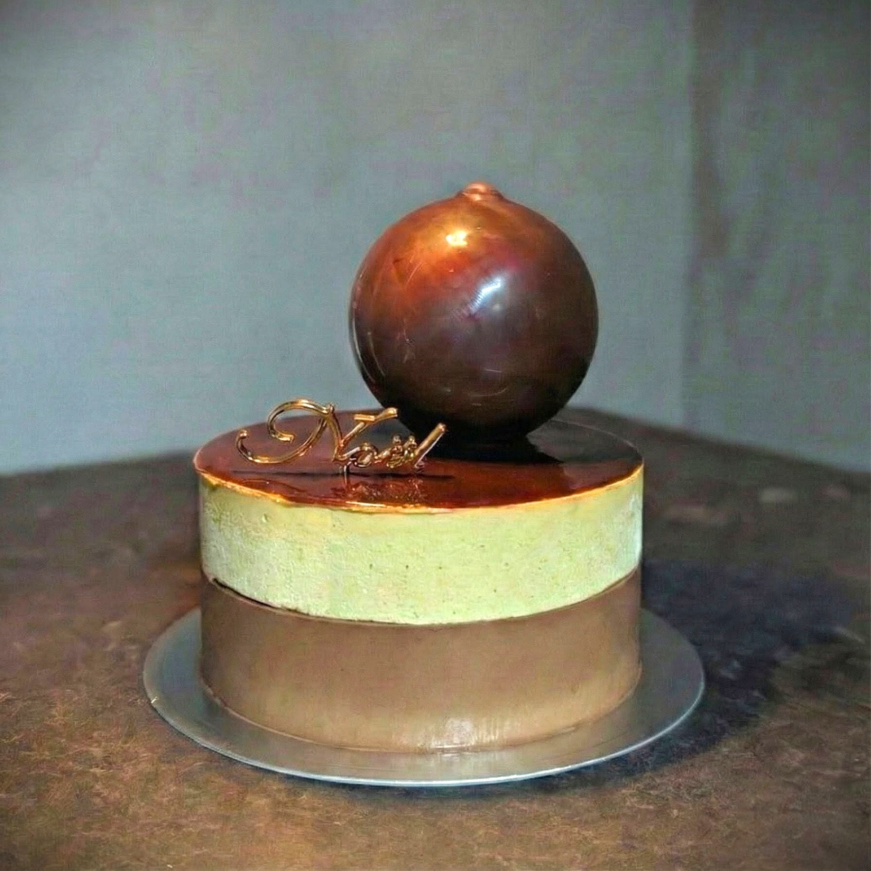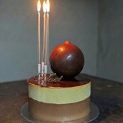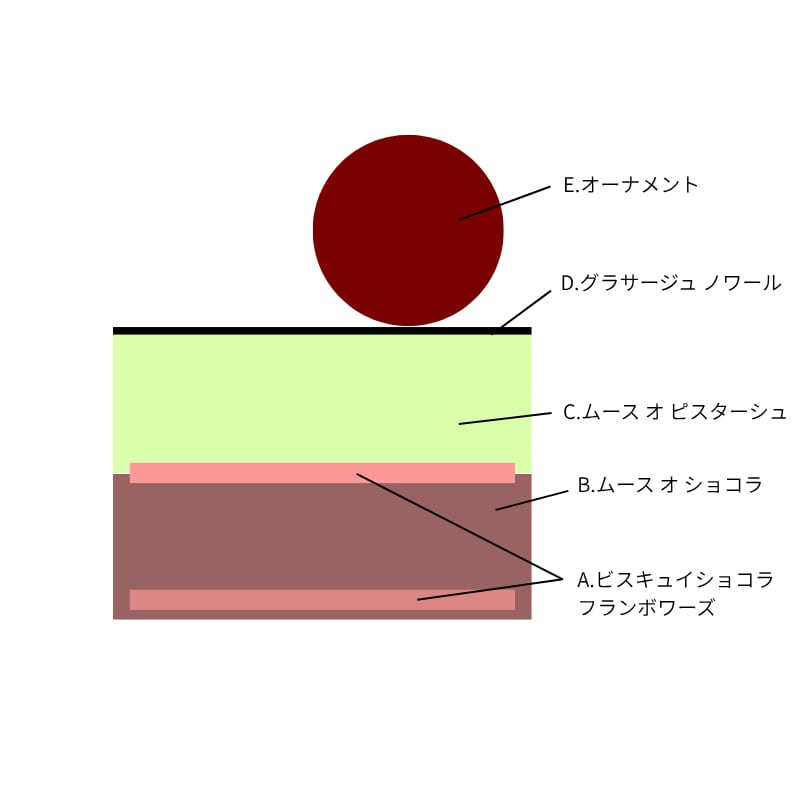 カカオ70%ビターチョコレートと、芳醇なピスタチオの二層ムース。