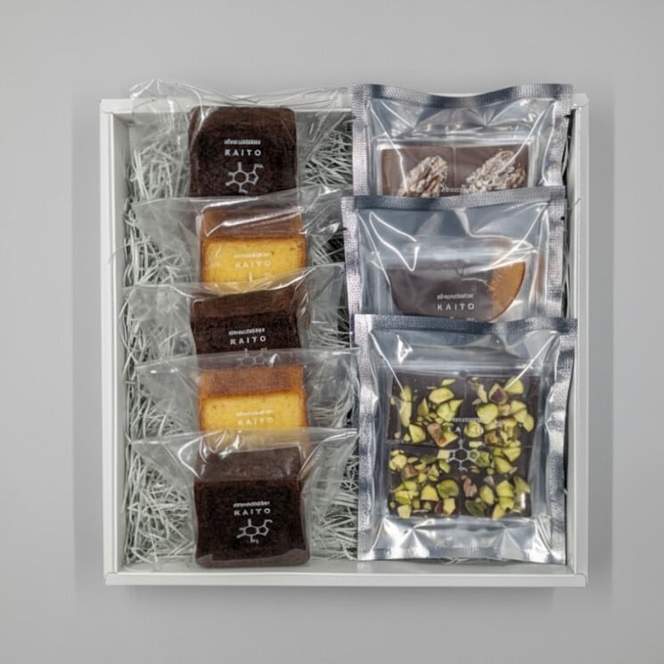 ケークオショコラ:卵、バター、砂糖、薄力粉、アーモンドパウダー、転化糖、グレープシードオイル、カカオ豆、カカオバター、オレンジ、ペーキングパウダー、バニラエキス、乳化剤(大豆由来)